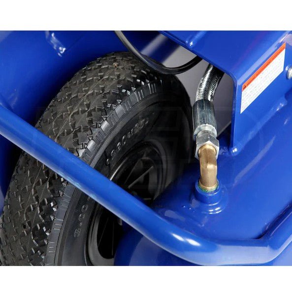 The Quincy Gas-Powered Wheelbarrow Portable Air Compressor features a 5.5 HP Honda GX160 engine and a splash-lubricated, twin-cylinder cast iron pump that delivers 11.1 CFM at 40 PSI and 9.5 CFM at 90 PSI, with a lifespan of over 10,000 hours. Designed for portability with sturdy handles and a pneumatic wheel, it also includes an auto-idle feature for efficient performance.