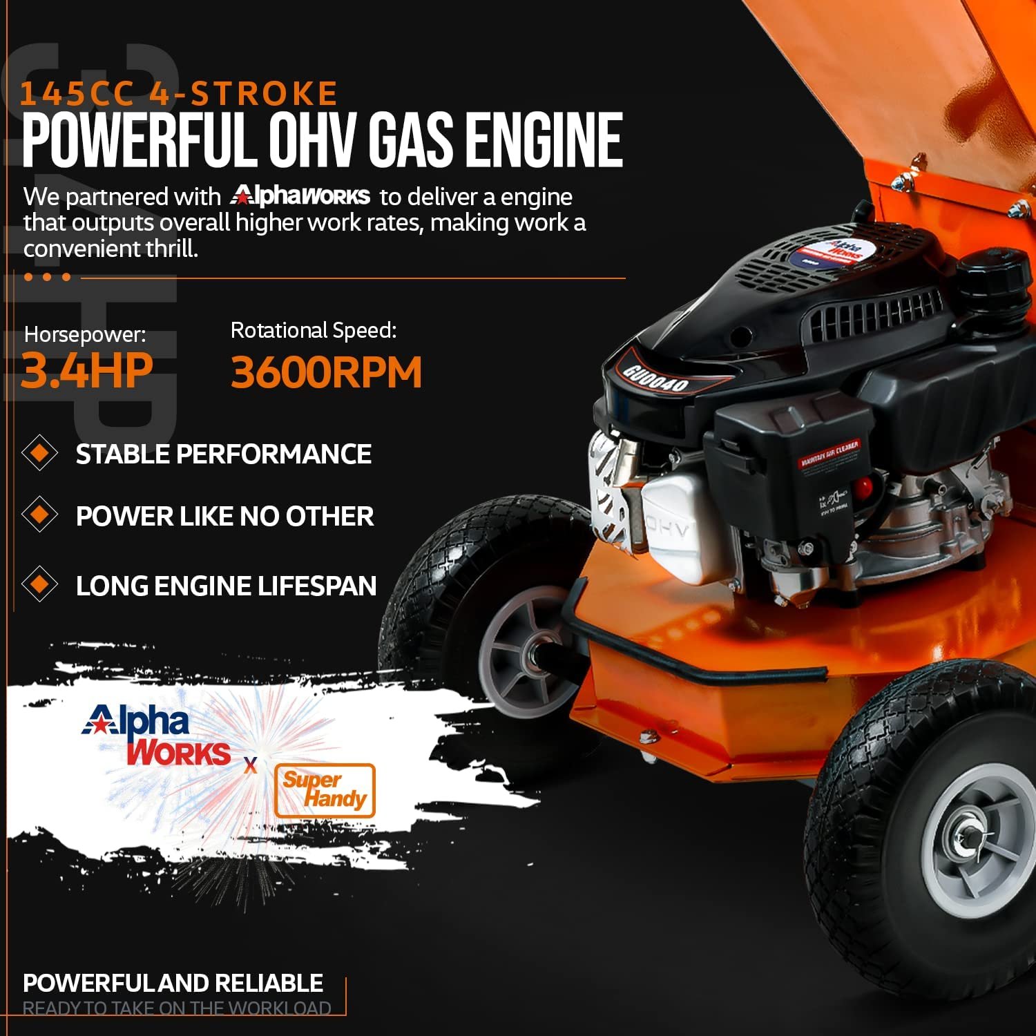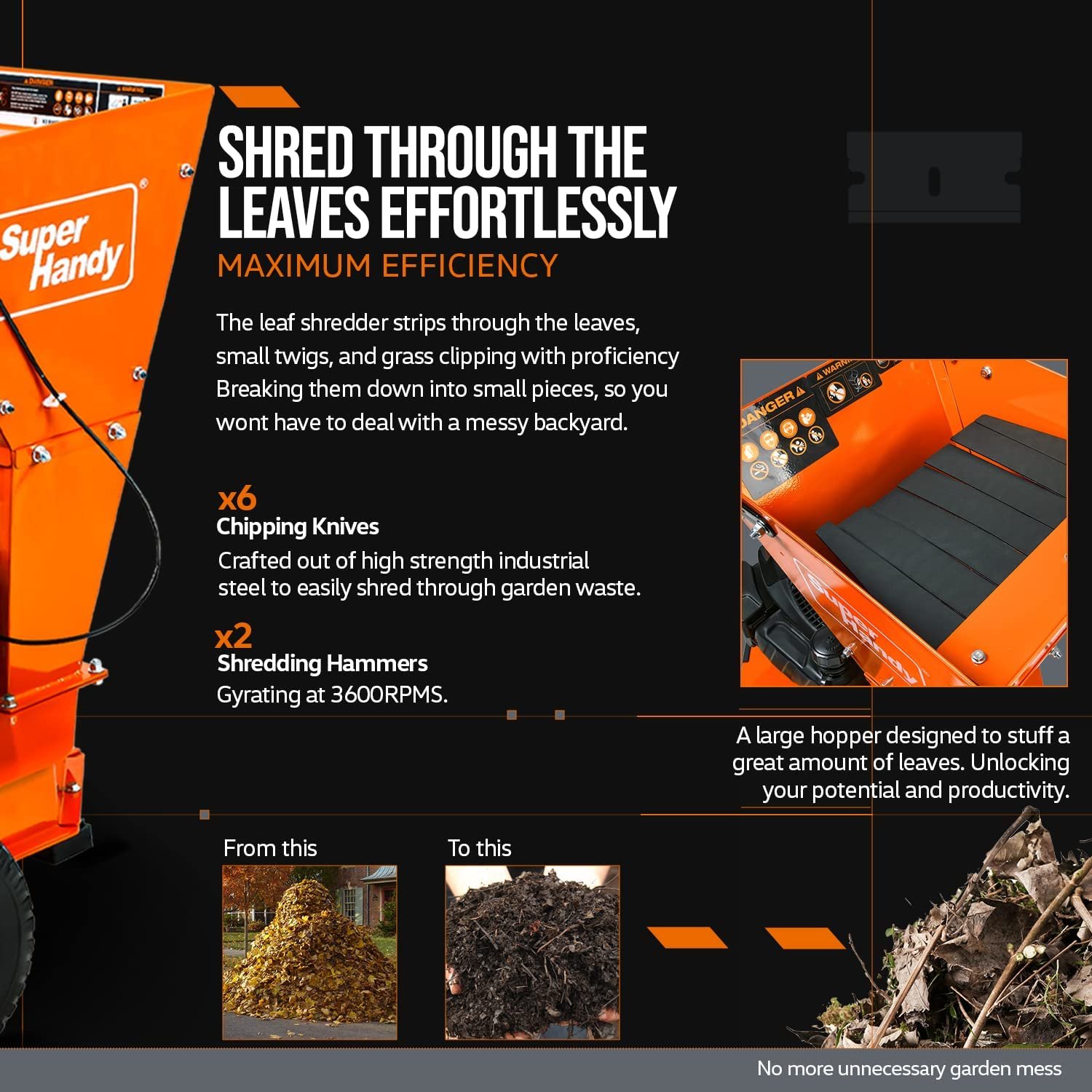 This One of a Kind Gas Powered Leaf Mulcher Shredder durable Heavy Duty Steel housing design with Upper Feeding port & Body. We are powering this machine with all powerfu145cc OHV Gas Powered Engine capable of 1”inch (25mm) MAX Diameter small branches/ twigs. Providing consistent speeds with (6) Chipping blades and 2 Shredding Hammers gyrating at 3600RPMs.