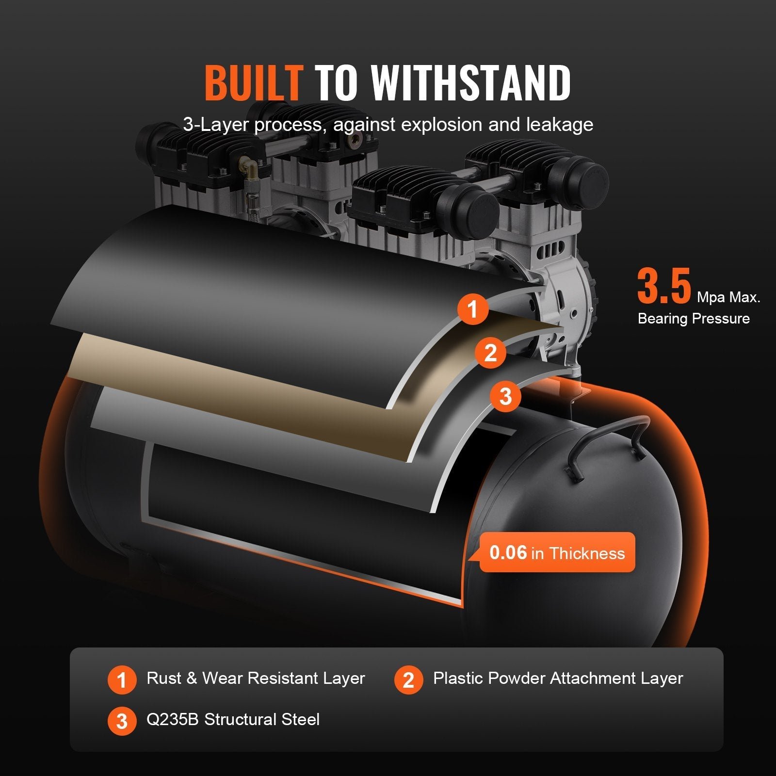 This horizontal air compressor features a 4 HP oil-free motor, delivering ample power to meet the demands of various pneumatic tools. It offers sufficient air and power support for nailing, painting, and other applications. Equipped with a 20-gallon large capacity air tank, this air compressor ensures continuous and stable air supply during long and intense work sessions. It also features an overheat protector, overload protector, and pressure release safety valve for a safe and reliable experience.
